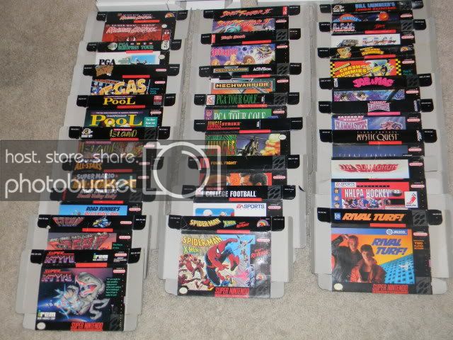This auction includes the 26 pictured SNES boxes as well as 25 cardboard box inserts. Of the box inserts, 2 are old style beat up, 18 old style pretty nice, and 5 of the new style. If you have trouble reading a title of the 26 included boxes, just ask.