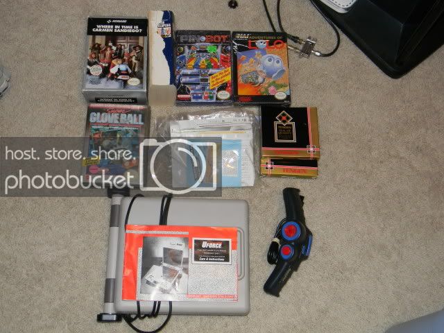 Random NES stuff. The desk encyclopedia back cover is missing, and writting inside carmens box. Cello still on the 2 NES boxes for Pinbot and Lolo, both boxes very nice. No games are included for these 3 boxes. 2 Tengen Sleeves, a random bag of box inserts and bags, untested and incomplete UForce with manual. Quickshot controller, and a Super Glove ball rental case, no game included.