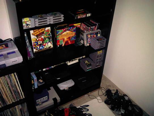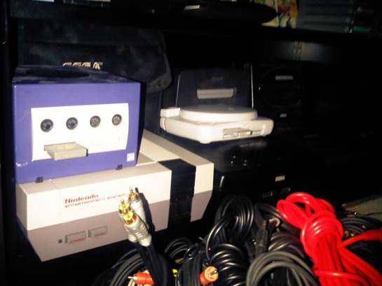 Here we can barely make out my NES, Game Cube, Saturn, PS1 w/screen, Game Gear, N64, Genesis, and 3DO.