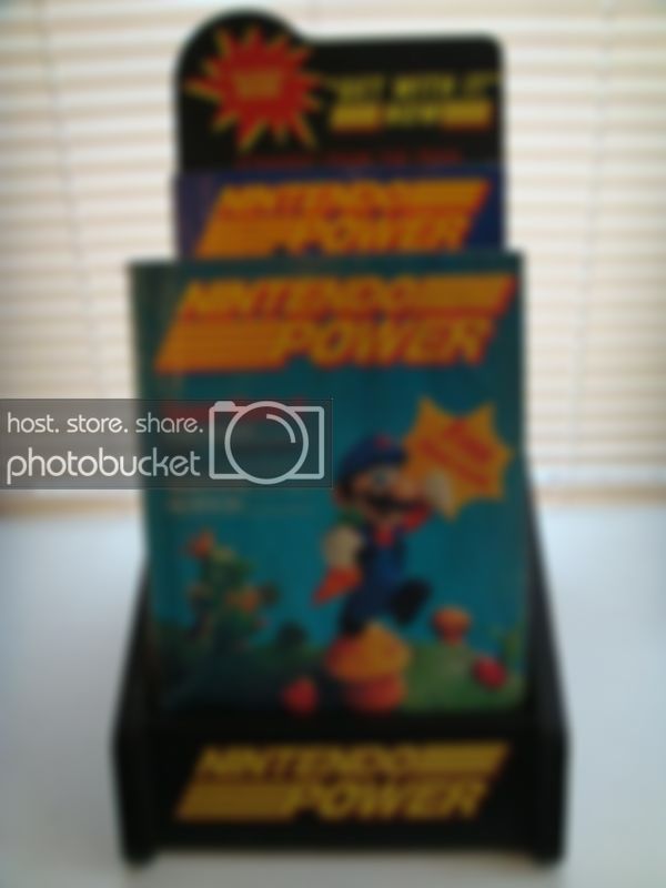 Item #3 an Original Nintendo Power Magazine Store Display Rack. The rack is made of wood and holds 30 issues of Nintendo Power (I have the 1st 30 issues in mine). The decals are imbedded in the wood. The top decal reads "The Official Nintendo Magazine" and "GET IT NOW," whereas the bottom reads simply "Nintendo Power"