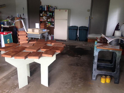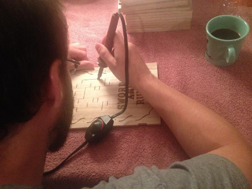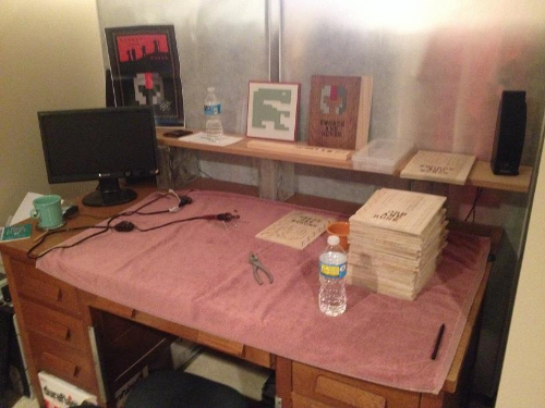 Having never really done this type of thing before, my working process was figured out as I went. I did what I could in our apartment, like drawing out and transferring the images to the wood, separating lids from bases, and running through a couple of test runs to see the quickest way to do things when full production began. I won’t get into all of the details here, but I basically turned my old desk into a small-scale assembly line, accomplishing one piece of the project at a time.