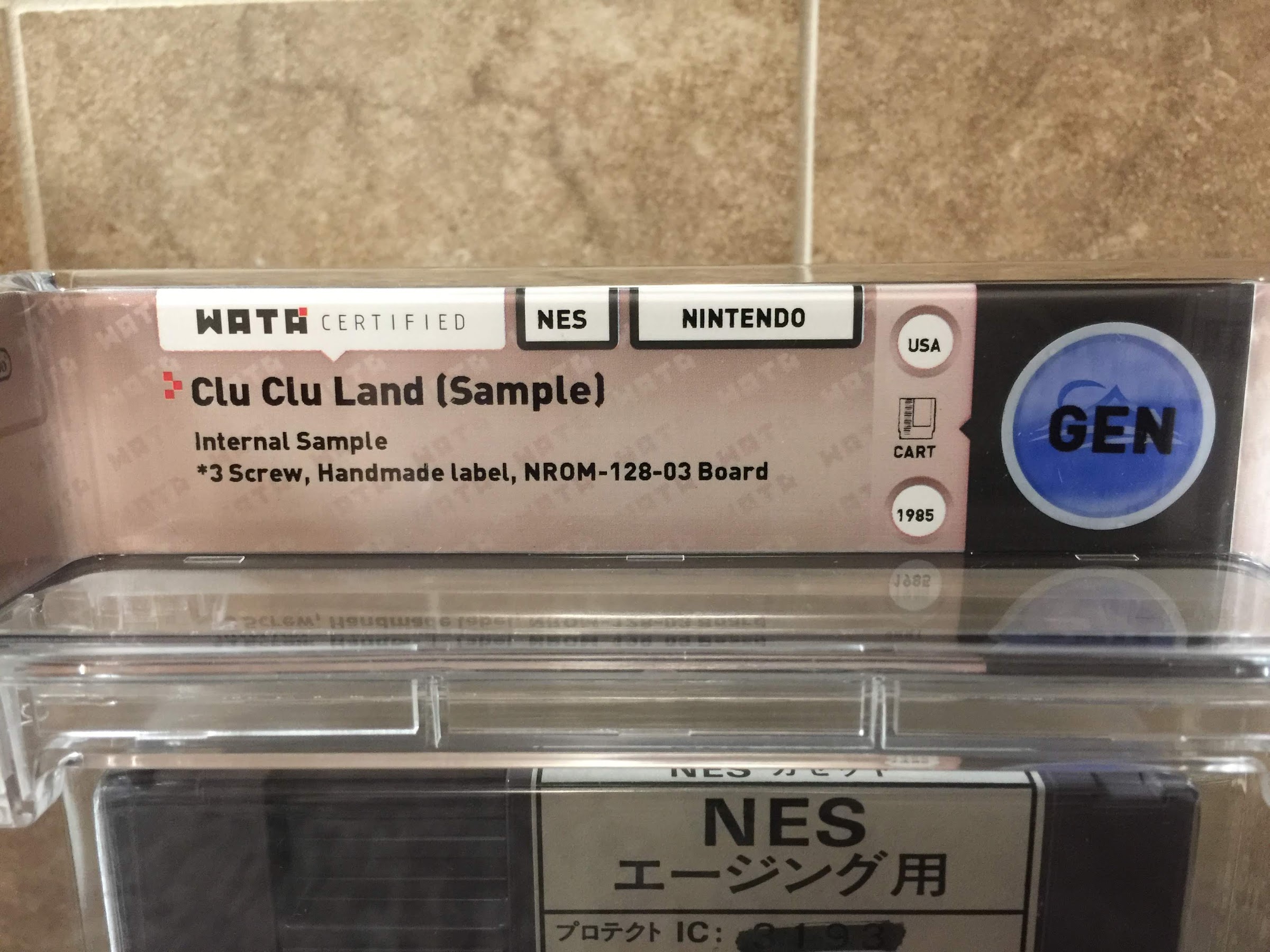 I'm just using the terms WATA set for the item.  I'm unsure of the exact use of the cartridge, but it says "protect" next to the IC, later it says "for aging" which is often seen in test applications in Japan.  Directly above the "NES" at the bottom, the characters read "Nintendo Co., Ltd.".