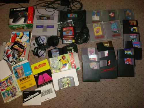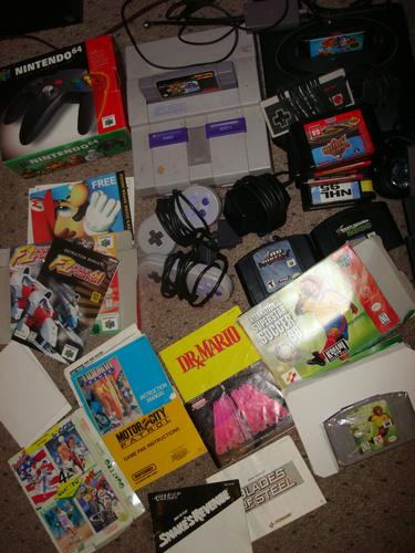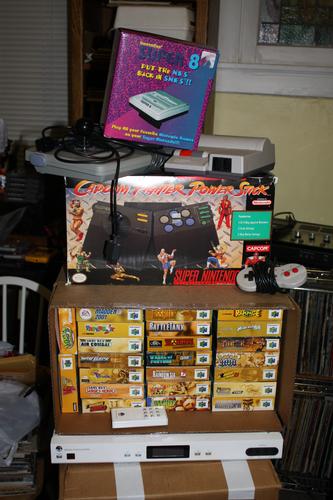 SNES with 2 controllers, system/game holder & games