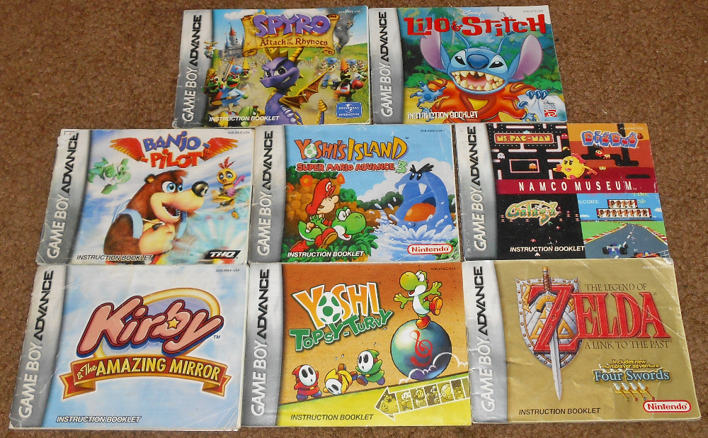 Up for auction as two separate lots are some worn manuals. First is Skyblazer with lots of wrinkles and writing inside on two pages. Second is the GBA lot with more wrinkles than are visible in the photo, but there are plenty of good titles in there. As far as I have seen, all the manual are complete--they just look very worn. Lot 1 will ship between cardboard, and lot 2 will ship in a box.